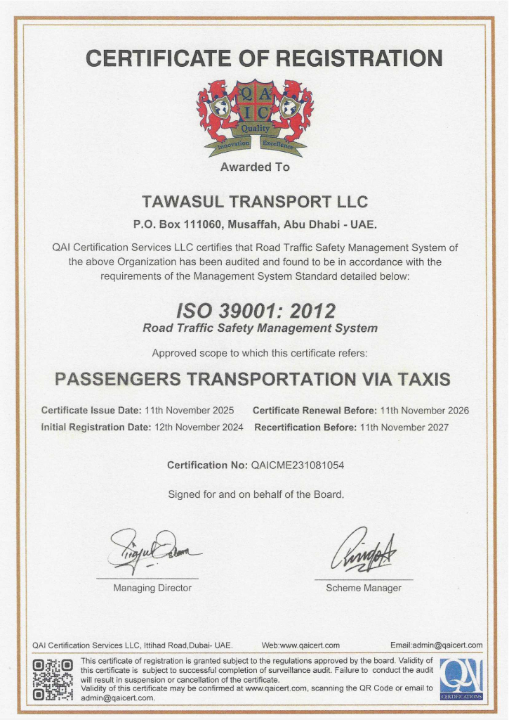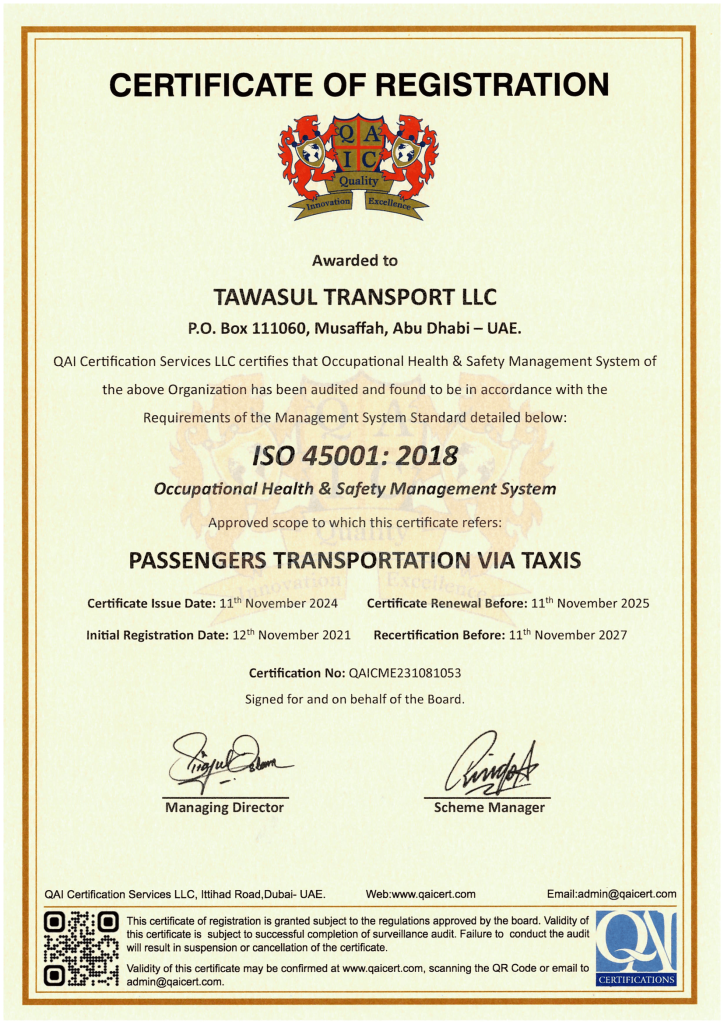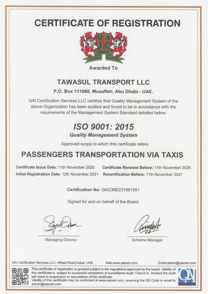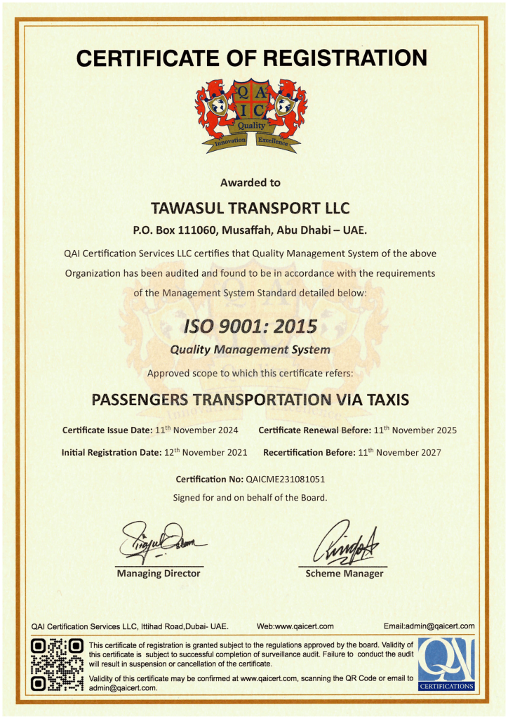 Tawasul Transport has been awarded ISO 9001: 2015 Certification for its entire Management Services from QA International Certification Limited, U.K. This highly regarded International Certification is a proof of our commitment to the highest standards of quality management and is an affirmation of it’s Leadership’s dedication to the continual quality improvement. Tawasul Transport has developed, implemented and has been maintaining the Quality Management System (QMS) in accordance with ISO 9001:2015 requirements. In fulfilling these requirements, entire range of business processes had to be integrated in the QMS. Further, this was achieved by monitoring the efficiency and efficacy of these processes through internal & external audits, maintaining flawless records, periodically reviewing the QMS for effectiveness, and adopting a critical approach to facilitate constant improvement. This was a rigorous process involving internal and external evaluations of QMS, identifying nonconformities and taking corrective measures to ensure continual quality improvement.